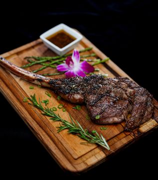 Bone-in tomahawk cut charcoal-grilled, served with chimichurri and rosemary