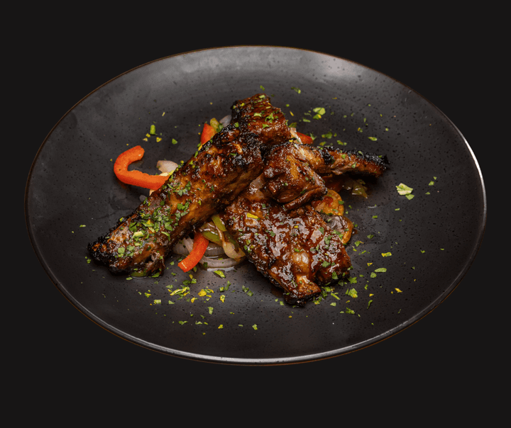 Baby pork ribs marinated in BBQ sauce and a touch of Latin spices